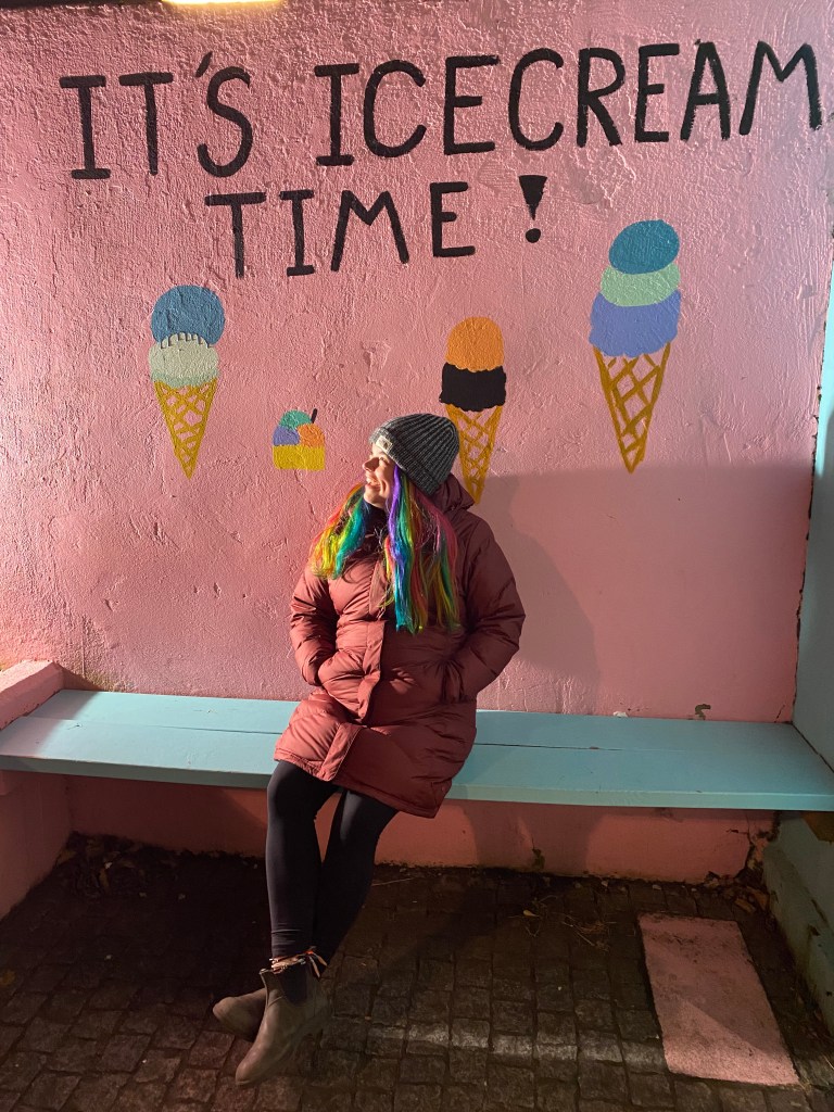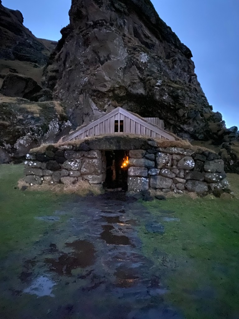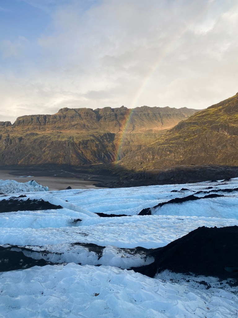 Day 2 was promised to be filled with many surprises according to Rocky. Our first stop was, of course, a surprise. We ended up stopping at this little house on the side of the road that has some folklore surrounding it. After that we headed to see Skogafoss in all it’s glory but before the sun was really up. It was really thoughtful of Rocky because he only gave us long enough to take photos as we needed to be at our next stop at a specific time but it gave us the chance to take photos without people. Our next stop was a glacier hike on Solheimajokull which I was really looking forward too. Before this trip I’d never done a hike on a glacier before. The hike was something really special as it had been raining off and on all morning and we were rewarded with a stunning double rainbow at our highest point on the glacier. Can’t complain about the rain when you get sights like that. From the hike we headed back to Skogafoss to actually properly see the waterfall in daylight and eat some grub. This was another restaurant that I had eaten at (and actually stayed at the hotel as well) over the summer so I was super pumped for the food. We got to enjoy yet another double rainbow of the day while eating and looking out at the falls. From Skogafoss we headed to Dyrhólaey view point for some stunning abet very windy views. Afterwards we drove down the hill to the black sand beach, Reynisfjara, which is equally famous for its views and its sneaker waves. I’d been to this beach twice before (summer 2016 and summer 2022) and I’d never seen the waves this angry. I took one look at Mel and told her I would’t even go on the beach itself. We ended up walking over some rocks at the beaches edge to take some photos before sitting ourselves at a bench in the local cafe and enjoying some warm drinks. It’s incredible how a change in the weather can change conditions so quickly. For those of you who’ve been before let me paint you a picture – normally you can walk past the basalt columns so you can see the sea stacks right? You couldn’t do that, you couldn’t even walk up to the basalt columns for fear of being lost to sea. The waves were coming so quickly and so fast. I don’t even think there were actually any sneaker waves when were there, the wind and swell were just so intense that it wasn’t safe.