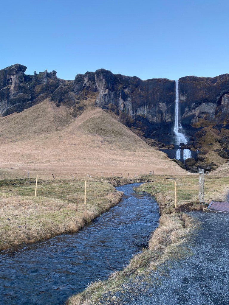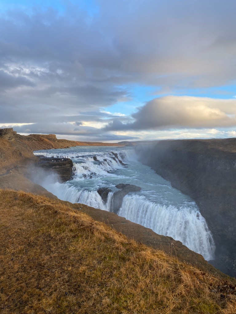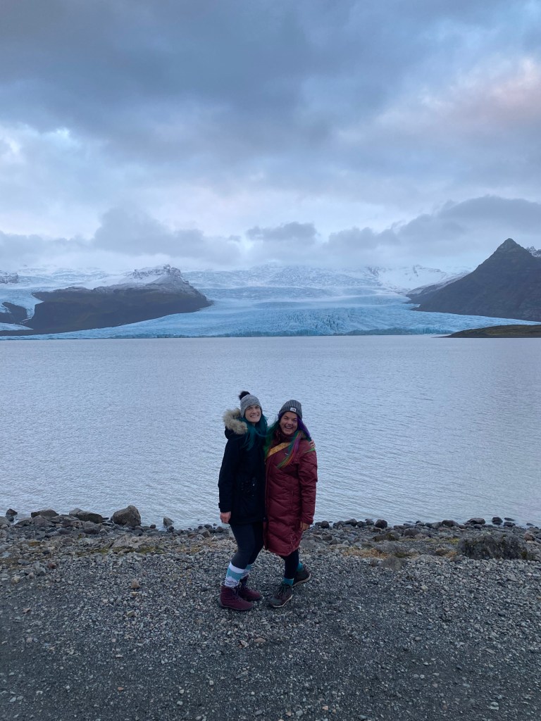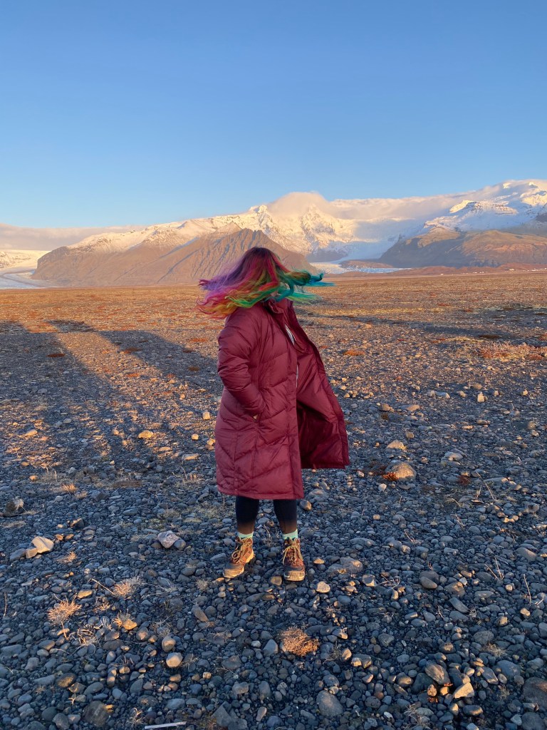 Day 3 (and the last day of the tour) began with a trip to a viewpoint near the Jökulsárlón glacier lagoon. Do to the easterly winds the icebergs of the lagoon weren’t visible from the parking lot the way they generally are so Rocky brought us to one where we’d be able to see them better. The easterly winds also pushed the icebergs away from the entrance to the ocean, so there were no diamonds at diamond beach. Instead Rocky took us to a few other surprises including another glacier lagoon. After Fjallsárlón glacier lagoon we made it to the ice caves, something I’d be waiting to see since I’d read about them that summer. Spoiler alert, they didn’t disappoint. The blues in the ice were just… I don’t have words. Just take my advice, go and see them for yourself before the day comes that we can’t. Lunch was out of a food truck back at the Jökulsárlón glacier lagoon. Finally had a vegan hot dog in Iceland that I loved, and could have eaten three of. From there we had one of our last surprises – Rocky had stopped at a viewpoint that Justin Bieber had made famous. I don’t care for Justin but golden hour was just starting and boy was she pretty on the Icelandic mountains. From there we stopped off at a foss I had stopped at over the summer that’s worth a photo or two and a great place to fill your waterbottle. Our last stop of the day was the surprise that was meant to make up for diamond beach and it definitely did. We ended up turning down a road that I immediately recognized and got SO excited about in the van because I knew were we were going. Rocky had taken us to Fjaðrárgljúfur canyon which I had wanted to take Mel too but knew we wouldn’t have time so this was perfect. Sadly we didn’t have the time to go to what I think is the best view point, but still so worth it.