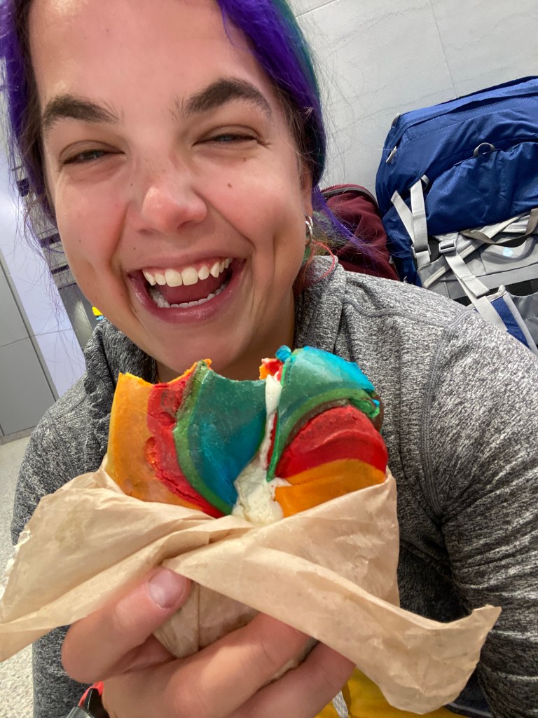 From left to right: Rainbow bagel in NYC; First sunset in Pucon; Volcano Villarica at night (check out the lava!)