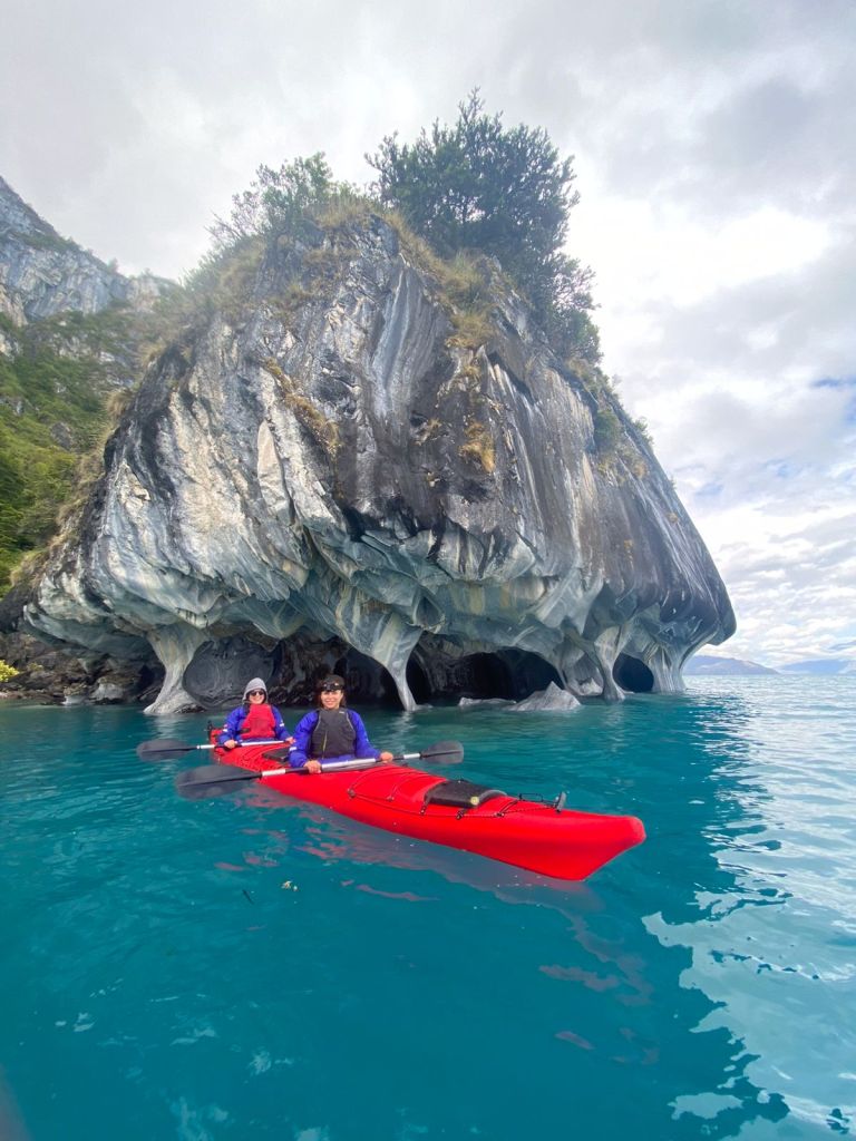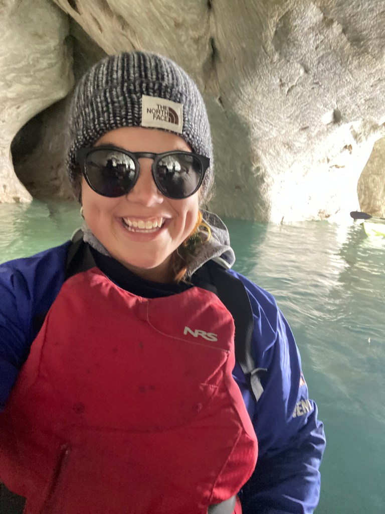 Once we left our beloved farm stay outside Puerto Ibanez, we drove to Puerto Rio Tranquilo. This stretch of road was, hands down, the worst that we saw during our week driving. It also didn’t help that the weather was miserable as well. I had such a headache from focusing so hard on the road but still went kayaking to see the marble caves as soon as we arrived in town. We got SO lucky with the weather this day. Apparently the lake that the marble caves are on tends to have rougher conditions. In English the name of the lake translates to Lake of Storms. The day we went though the water was glassy as could be. There were some other kayakers on the lake as well but it wasn’t overcrowded the way it apparently can become. If you want to see the marble caves but don’t kayak you can also do so by motor boat.