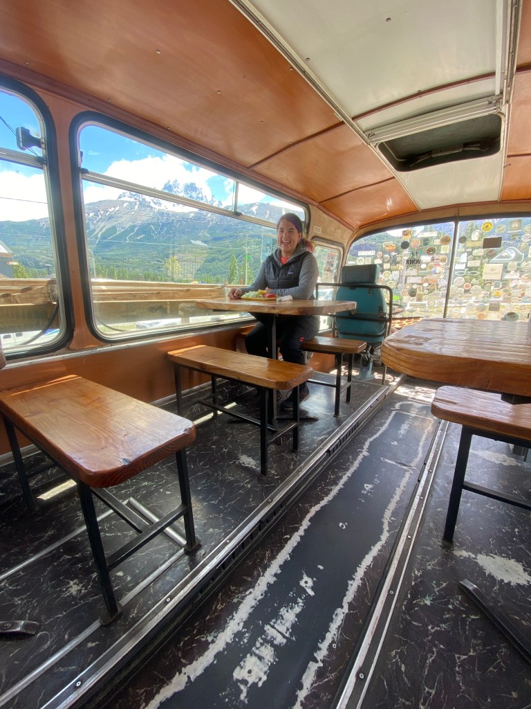 When we arrived at the next trail head, it turned out this was also a paid trail and would take longer to hike. At this point we just decided to turn around and hike back to the car (we were a good two hours from the car at this point). We passed our Ox friends again and were able to enjoy some beautiful views of the lupines along a river that passes by the area. We stopped in Cerro Castillo for a lunch in this super cute cafe that operates out of two buses.
